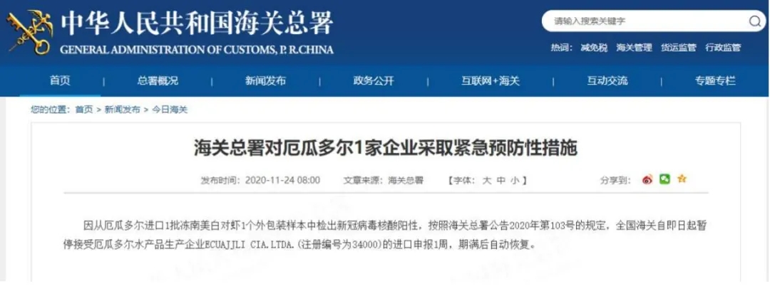 因從厄瓜多爾進(jìn)口1批凍南美白對蝦1個(gè)外包裝樣本中檢出新冠病毒核酸陽性,按照海關(guān)總署公告2020年第103號的規(guī)定,全國海關(guān)自即日起暫停接受厄瓜多爾水產(chǎn)品生產(chǎn)企業(yè)ECUAJJLI CIA.LTDA.(注冊編號為34000)的進(jìn)口申報(bào)1周,期滿后自動恢復(fù)。